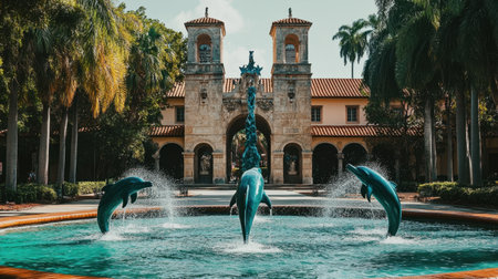 This captivating image features three playful dolphins emerging from a tranquil fountain, surrounded by vibrant palm trees and historic architecture.