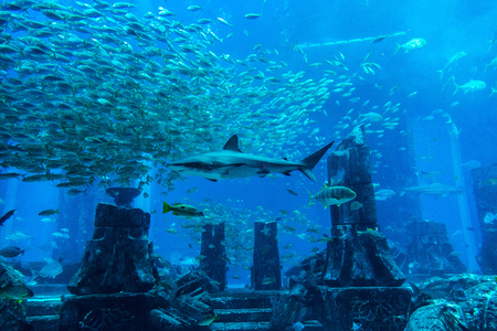 Las Palmas de Gran Canaria, Canary Islands, Spain - July 1st 2018: Visitors enjoy beautiful view of marine life in the biggest tank of new Aquarium Poema del Mar, with the largest curved window of methacrylate for exhibition, which exists in the world.