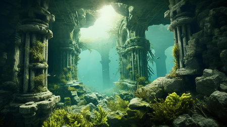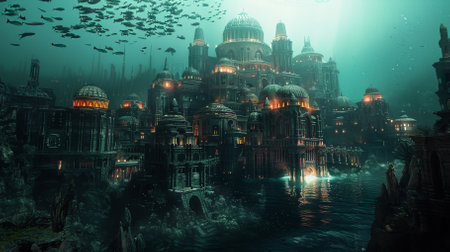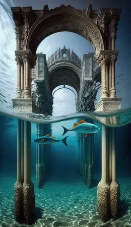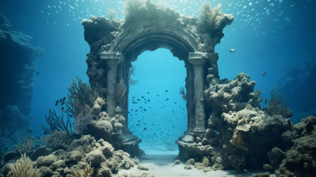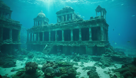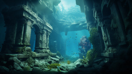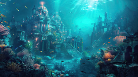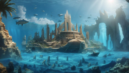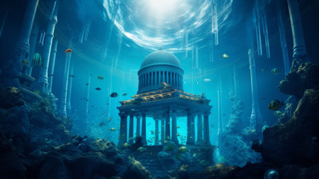 Sunlight filters through the clear blue water, illuminating the majestic ruins of a long-lost city on the ocean floor. A school of fish gracefully swims among the ancient columns and temples, a silent testament to a forgotten civilization now reclaimed by nature.