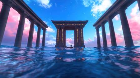 A solitary figure in a small boat navigates through the water, passing between colossal stone pillars and an imposing archway, creating a sense of mystery and exploration.