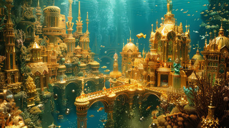 A breathtaking underwater cityscape, resplendent with golden architecture surrounded by marine life and coral reefs.