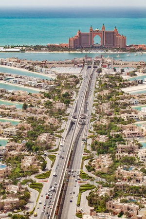 Dubai, United Arabic Emirates - October 17, 2014: PThe famous Atlantis The Palm Hotel on the artificial palm island taken from a seaplane.