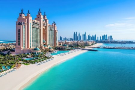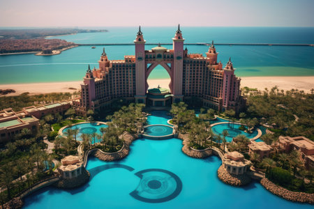 Aerial view of a beautiful luxury hotel and resort on Palm Jumeirah Island in Dubai, UAE, showing the turquoise waters of the Persian Gulf