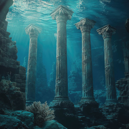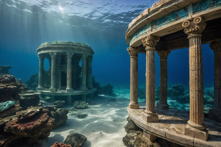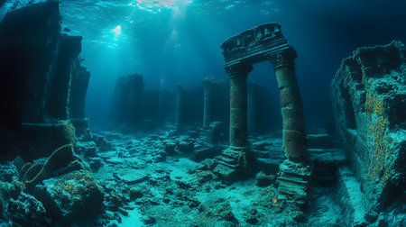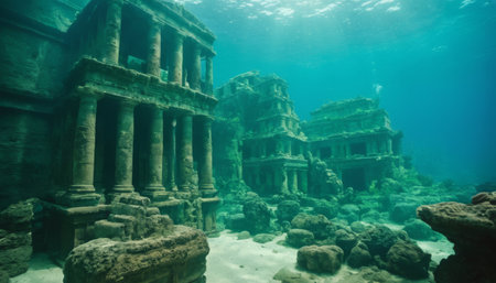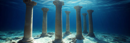 Sunken City Ruins Ancient Columns Submerged in Blue Ocean Depths, Exploring Lost Civilization