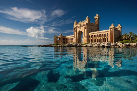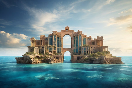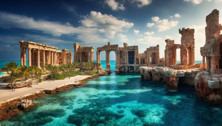 Beauty of the ruins of ancient Atlantis on the sea coast. AI generated