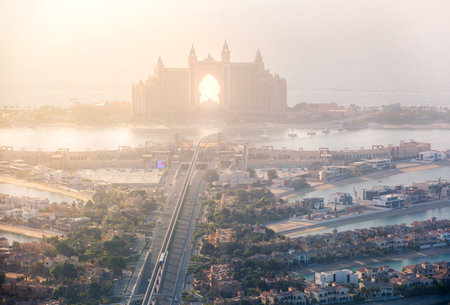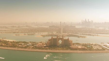 Dubai, United Arab Emirates - June 5, 2019: Atlantis hotel and the whole Palm island background in Dubai aerial view