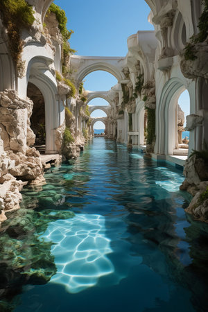 underwater temple believed Amphitrite's realm with coral arches and aquatic life