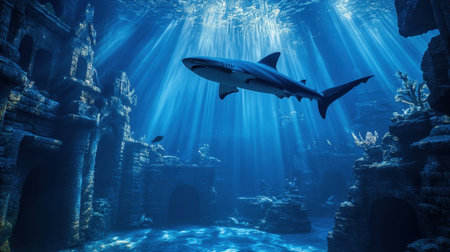 Dive into a breathtaking underwater scene with a majestic shark swimming above ancient ruins, illuminated by beams of sunlight pouring through the ocean depths.