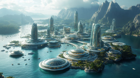 Futuristic coastal city featuring sleek skyscrapers and advanced technology surrounded by mountains and water during daylight. Generative AI