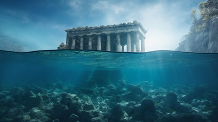 Tranquil underwater view of the ancient Greek temple in the ocean