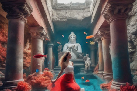 A beautiful girl is exploring the underwater world, ancient ruins at the bottom of the sea. fish, octopus, inhabitants of the deep sea