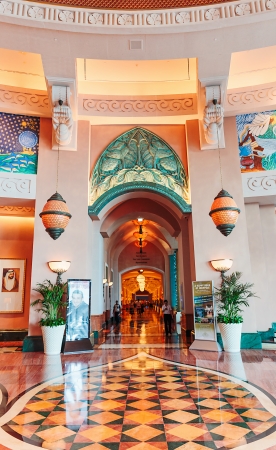 DUBAI, UAE-NOVEMBER 3: Hall of the Atlantis Hotel on November 3, 2013 in Dubai, UAE. The resort consists of two towers linked by a bridge, with a total of 1539 rooms.