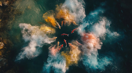 Aerial view of koi fish creating a vibrant swirl in clear water, showcasing an explosion of colors. Perfect for nature, tranquility, and beauty themes.