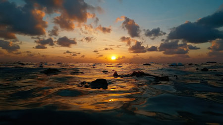A stunning sunset over ocean with floating debris