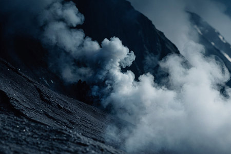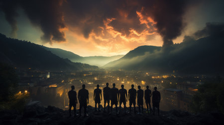 A silhouetted group of people is seen against a backdrop of smoke and atmospheric lighting. The image features a dark, muted color palette with a prominent cloud of smoke illuminated by a light source. The composition suggests an outdoor environment, with potential uses in various commercial and editorial contexts.