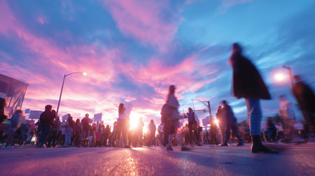 Crowd gathers on street at sunset with colorful sky and streetlights in view
