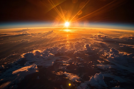 AI Generated. Dramatic sunrise or sunset seen over Earth from outer space