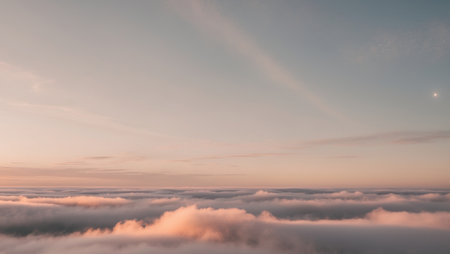 A breathtaking view from above the clouds, showcasing the gradient of the blue sky and a faint moon.