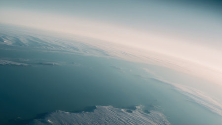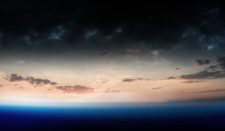 An artistic depiction presents a view of Earth's atmosphere, highlighting colorful layers of light. The composition features cloud formations below, with a blend of orange, blue, and black hues, suggesting a sunrise or sunset. The image's details and style lend themselves to editorial or commercial applications.