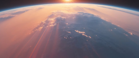 A beautiful sunrise emerges over the Earth's horizon, highlighting the layers of the atmosphere and cloud formations. The view captures the vastness of space and the transitions of light.