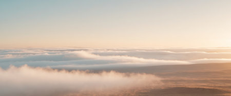Above showing sunrise sun rays breaking through clouds with soft pink and orange hues creating a serene and ethereal atmosphere above a layer of fog or low clouds....