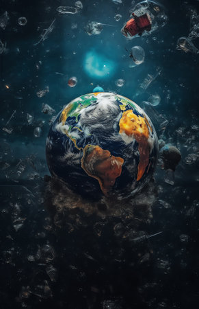 This stunning image showcases the Earth enveloped by various space debris, emphasizing the environmental challenges we face in space exploration and preservation.