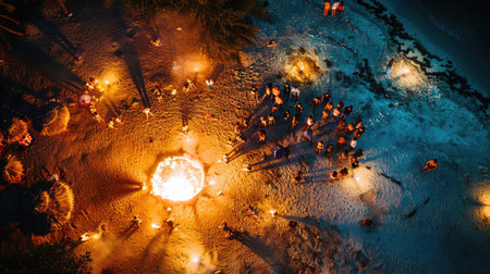 A circle of people gathers around a fire, seeking heat and comfort in the snowy landscape. The darkness enhances the art of the flames, creating a symmetrical and mesmerizing scene AIG50