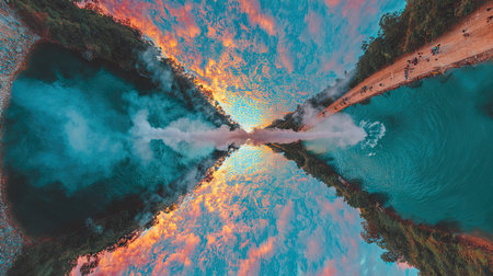 An overhead view reveals a mirrored landscape with vibrant colors. Turquoise water reflects the hues of a sunset sky, blending with orange and blue tones. The symmetrical composition emphasizes textures and contrasts. This image could be used for various commercial or editorial projects needing unique visual elements.