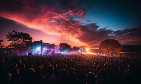 A stunning view of a vibrant concert with colorful lights illuminating an enthusiastic crowd at a music festival. The atmosphere buzzes with energy and excitement.