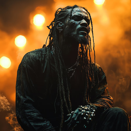 Black guy with blonde dreadlocks posing in the dark outfit with the emotional face in action
