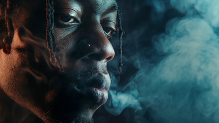Face of young handsome African Rastafarian man smoking outdoors at night