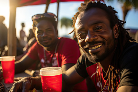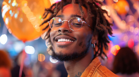 Man with dreadlocks dancing and having fun on a music festival. Young and cheerful couple on a music festival
