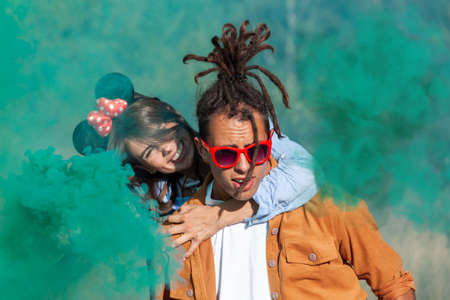 Beautiful young man and woman hold light up colored smoke bombs - Happy friends having fun in the park with multicolored smoke bombs - Young students celebrating spring break together. Holi festival.