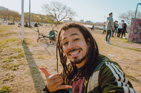 young caucasian venezuelan man with dreadlocks making selfie photo with his phone, smiling with good attitude outdoors, walking in the park at sunset, copy space, lifestyle concept.