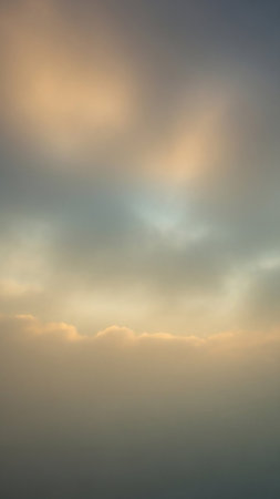 A soft, hazy sky filled with diffused light from golden hour, featuring gentle orange, blue, and grey clouds creating an atmospheric and serene backdrop.