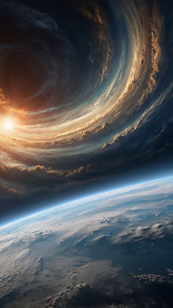 Earth lodged in the eye of a storm, visible from space amidst swirling clouds