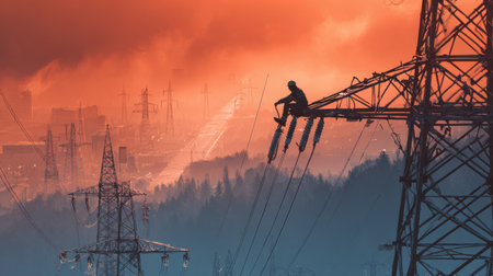 A technician sits on a high voltage tower, surrounded by power lines and a smoky landscape at sunset, with vibrant orange and blue hues in the sky.