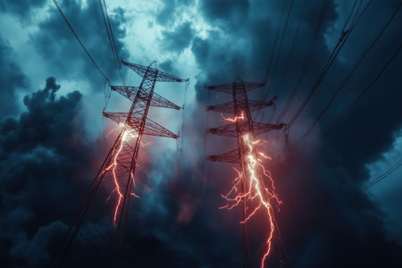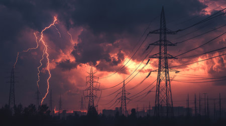 A dramatic thunderstorm with high-voltage power lines and towers visible in the foreground, with lightning illuminating the sky, highlighting the power and potential hazards of high-voltage electricity.