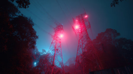 Surreal view of power lines and transmission towers glowing with red and blue lights amidst a foggy forest, creating an eerie and atmospheric scene.