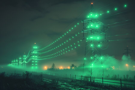 a high power line tower against a starry night sky, with blue laser beams streaking through the darkness, illuminating the electric grid