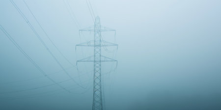 High Voltage Power Line Tower in Dense Foggy Weather.