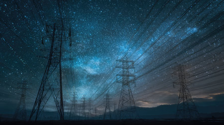 A captivating scene featuring electric power lines silhouetted against a stunning night sky filled with stars and galaxies, blending natural beauty with human technology.