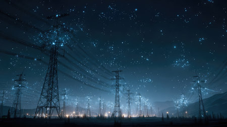 A stunning night landscape featuring towering electricity pylons surrounded by a starry sky and glowing blue lights, creating a captivating blend of nature and technology.