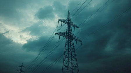 An image showcases a power plant featuring tall metal structures and overhead wires against a cloudy evening sky. The composition emphasizes the industrial nature, with dark hues, creating a sense of scale and providing a visual of energy. Suitable for various uses within the energy and infrastructure sectors.