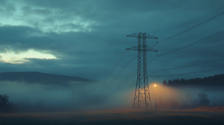 A high-voltage power transmission tower illuminated by the soft light of dawn, with fog rolling in the background, creating a dramatic and atmospheric scene.