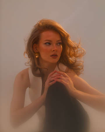 Redhead young female wearing golden earings, studio portrait of sensual ginger woman with stylish hairdo