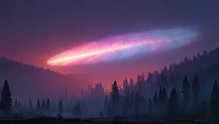 An illustration depicts a cosmic phenomenon over a silhouetted forest. The scene features a dynamic interplay of color, with vibrant pink and blue hues illuminating the sky. The composition showcases a tranquil, outdoor environment. Suitable for artistic prints and other commercial applications.