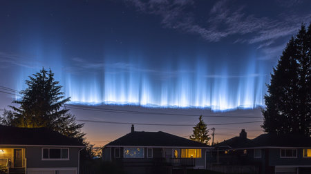 Stunning display of light pillars stretching across the night sky, creating an enchanting atmosphere over a peaceful residential area, perfect for nature lovers.