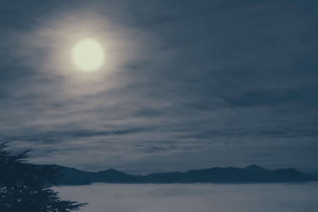 Full moon night landscape, fog in the valley