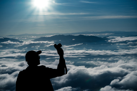 tourist man hold camara with sunrise and sea of fog view on phu chi fa mountain area and national forest park in chiang rai, Thailand.